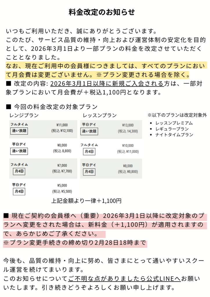 2月28日までに体験・ご入会いただいたお客様は、料金改定前の現在の料金でご入会いただけます。